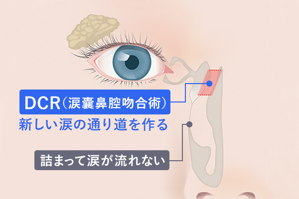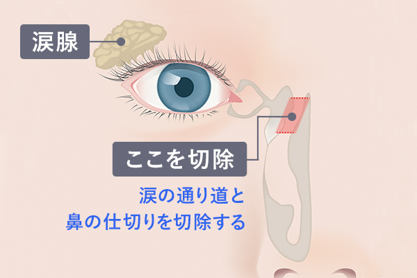 涙管チューブ挿入術とは異なり、閉塞してしまった鼻涙管を再開通させるのではなく、骨を少し削って涙嚢と鼻腔と外科的に直接つなげてしまうやり方です。